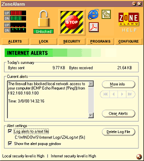 Current Alerts displays the current alert information: the IP address, port, protocol and time and date of the connection attempt; a short message describes if the Alert is incoming or outgoing communications that have been blocked and possibly the application causing the alert. This information can be submitted to the Alert Analyzer for obtaining more detailed information as to the nature of the block. When the More Info button is pressed, the alert information is sent to us over the web in order for us to compare to our knowledge base of reasons and causes for the firewall to block communications. If you wish to track the IP address of a blocked incoming connection, you can use whois or traceroute to possibly find the owner of the IP address. Alert Settings lets you decide what to do with an alert. Alerts can be logged to a text file in CSV format, and the Visual Alert notification can be turned off all together. When logging the alerts, the log is stored as ZALog.txt in the ZoneAlarm default location, in a folder called Internet Logs in your Windows install directory. The size of the log is displayed next to the location, and the log can be deleted when you feel it is appropriate, so it does not get too big. Log entries look like this: "FWIN,2000/03/07,14:44:58,-8:00